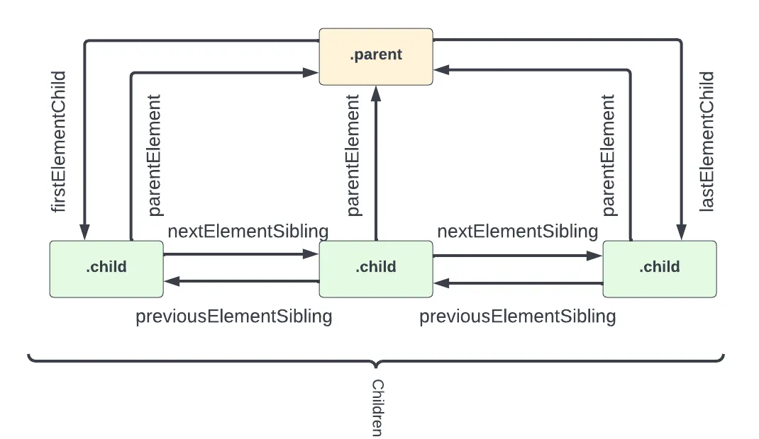 As you can see, working with related elements is not that difficult because we have access to these useful properties. In the next video, we will look at properties to work with other types of nodes.