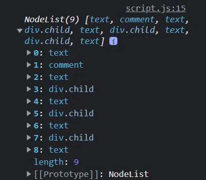 As you can see, we get a NodeList of 9 items. I want to go over what each of these items are…