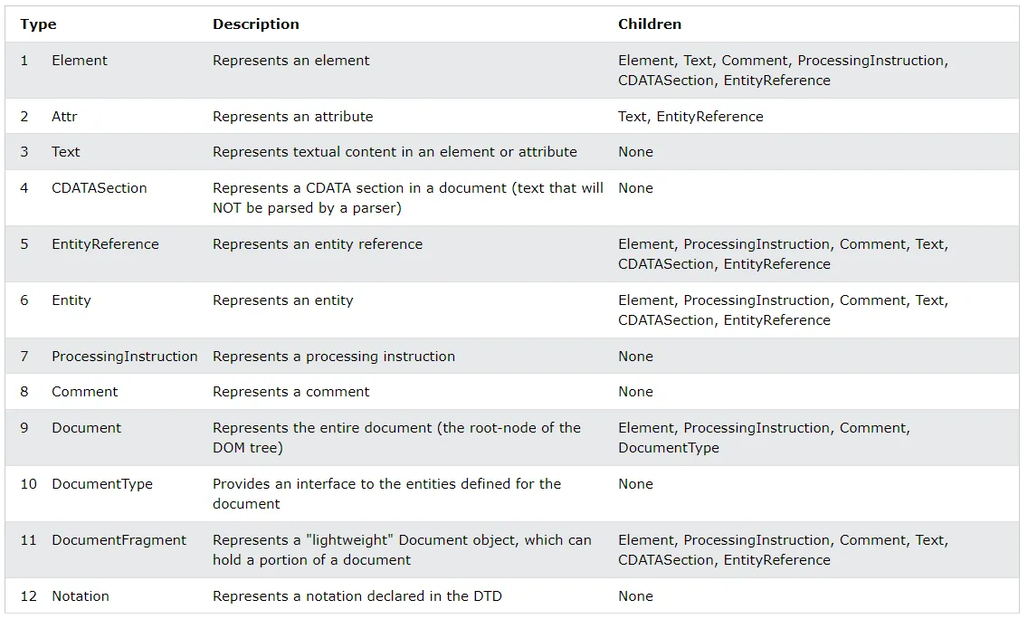 Alright, so we looked at some important properties of the DOM that allow us to work with related elements. However, the DOM has more than just element nodes. In fact, there are 12 different types of nodes.