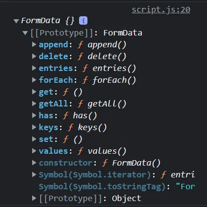 We can get all of the form data by using the entries method. This will return an array of arrays, where each array is a pair of values. We can see them by using a for of loop.
