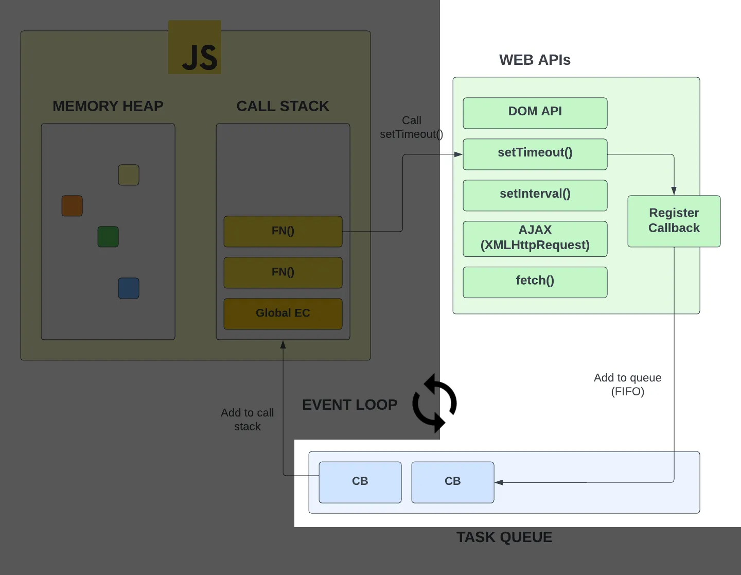 Outside of that, in the green box, we have a bunch of web APIs that are accessible to us via the browser and the global object. Remember, this is created during the creation phase of the global execution context.