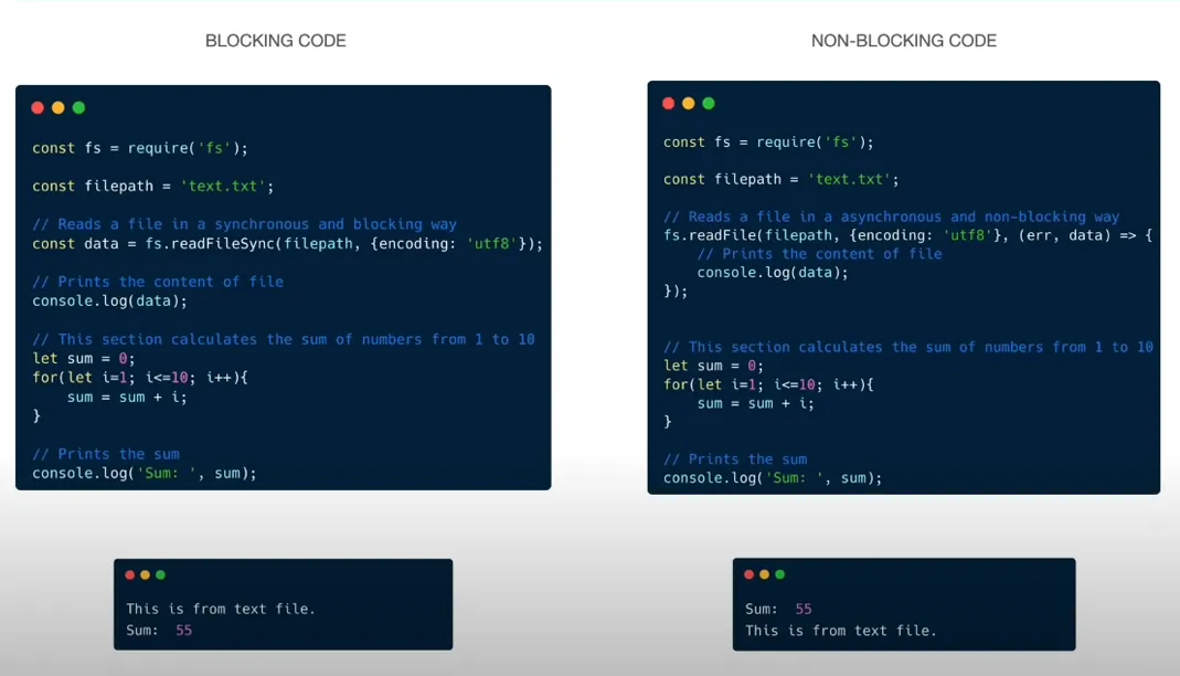 On the right, we are using the readFile() method. This is a non-blocking, asynchronous method. It will read the file but it will not block the execution of the program by making it wait. The way it works, is it takes in a callback function and when the file is read, it will execute the callback function. In the console, we see the sum first and then the file contents, because we did not have to wait for the file to be read before calculating the sum.