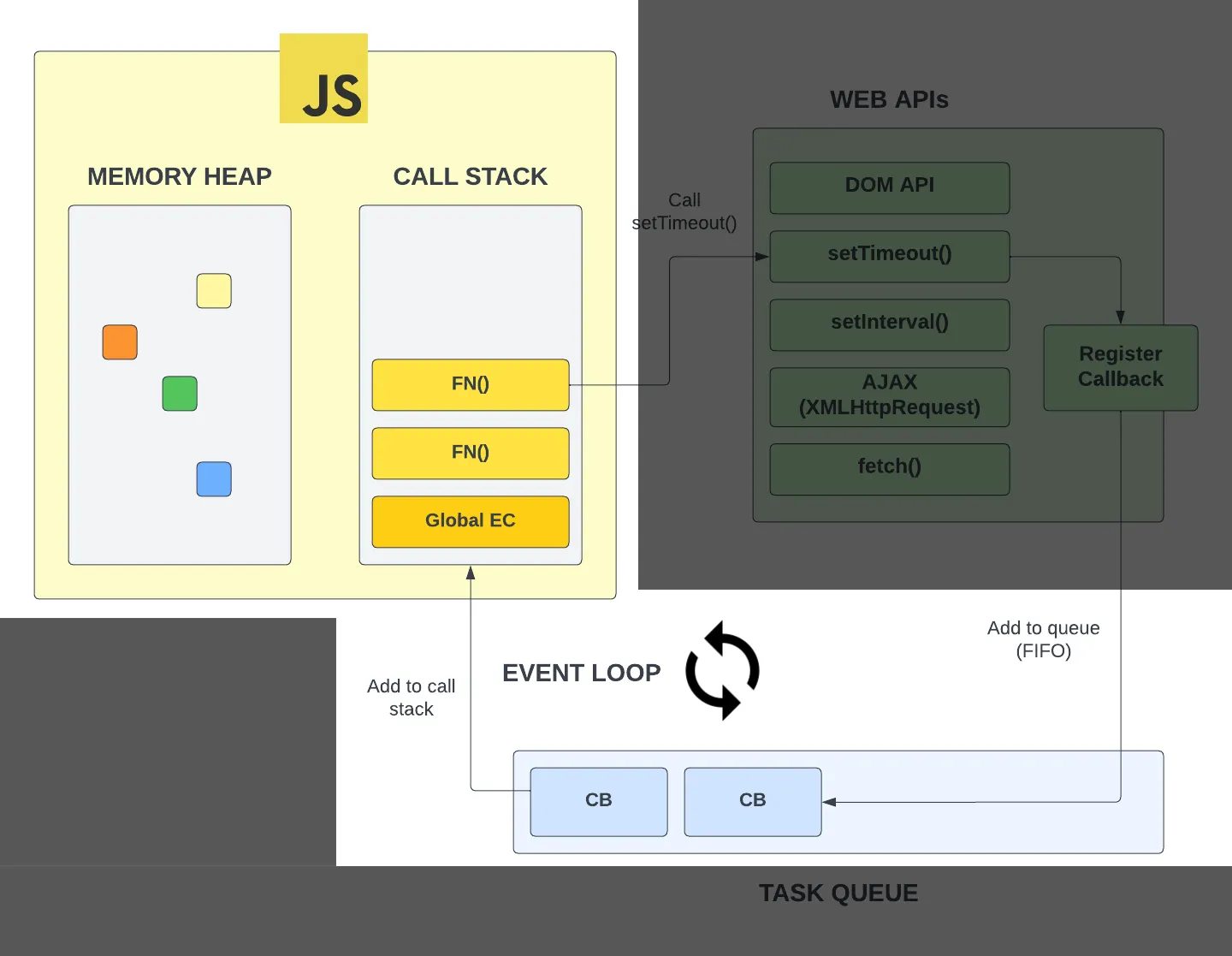 The yellow box represents the JavaScript engine. This is the part of the browser that executes our JavaScript code. This is where our call stack is that executes all of our functions, etc. This is also where the memory heap is, which is where all of our variables and objects are stored.